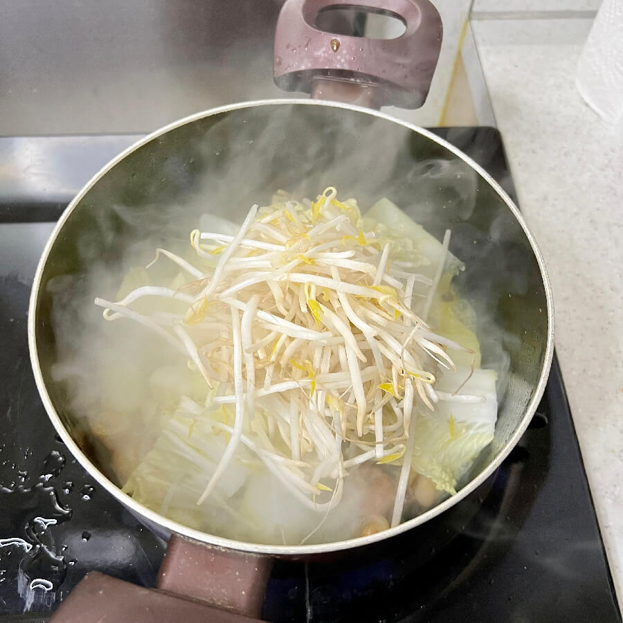 3. 프라이팬에 기름을 두르고 냉동해산물과 배추 줄기 부분을 볶아줍니다. 배추줄기가 살짝 숨이 죽으면 나머지 배춧잎과 숙주나물을 넣고 볶아줍니다.