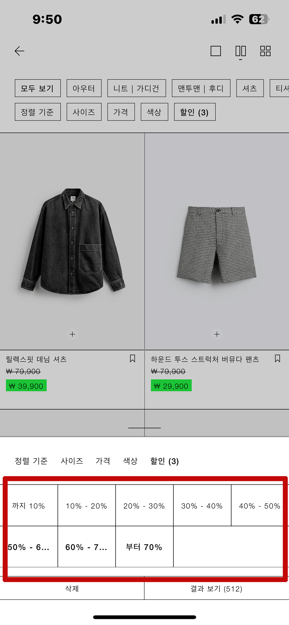 3. 상단 메뉴 중 "할인"을 클릭합니다. 할인 율이 높은 순을 몇 개 선택하면 할인이 많이 되는 제품들이 나열됩니다.