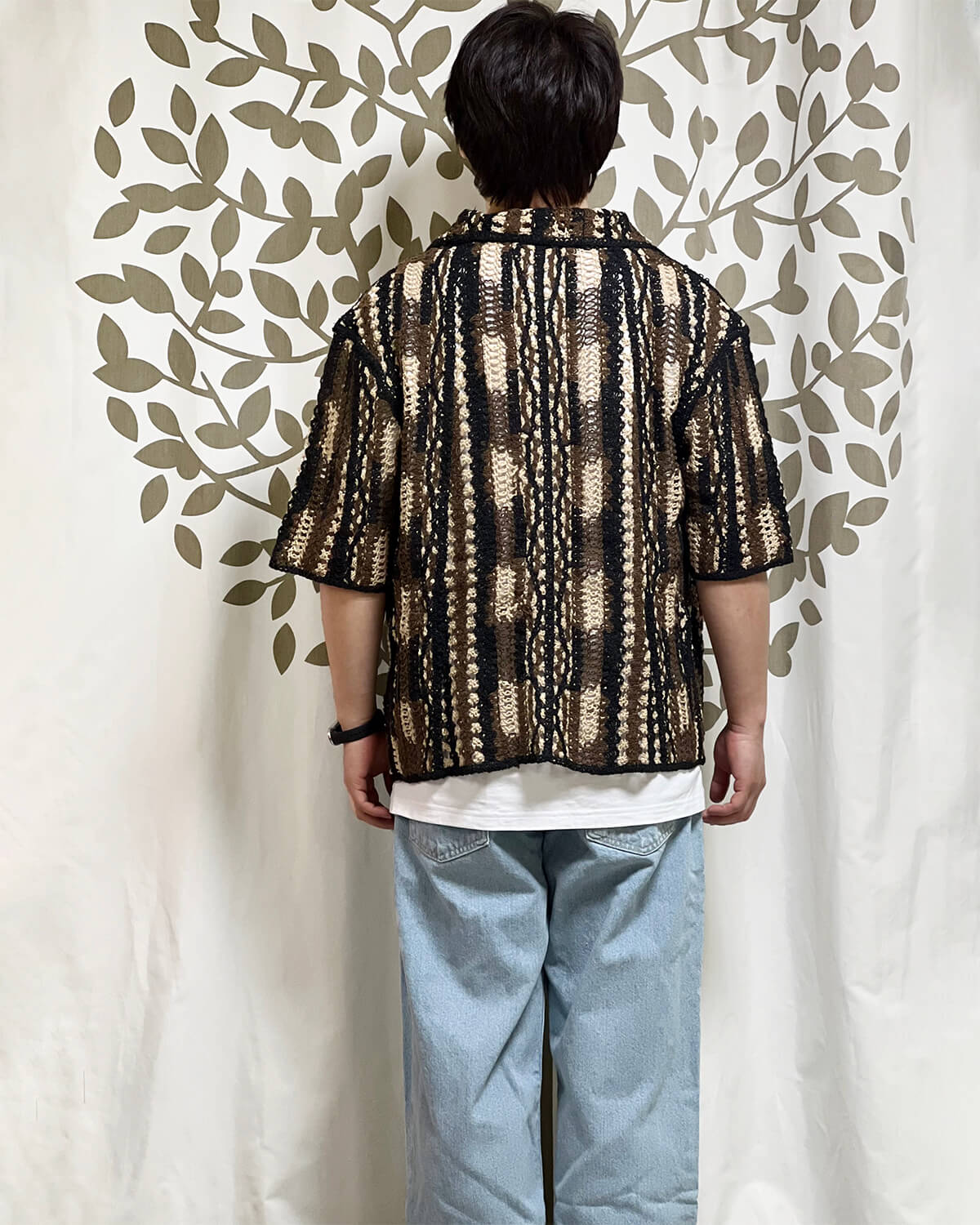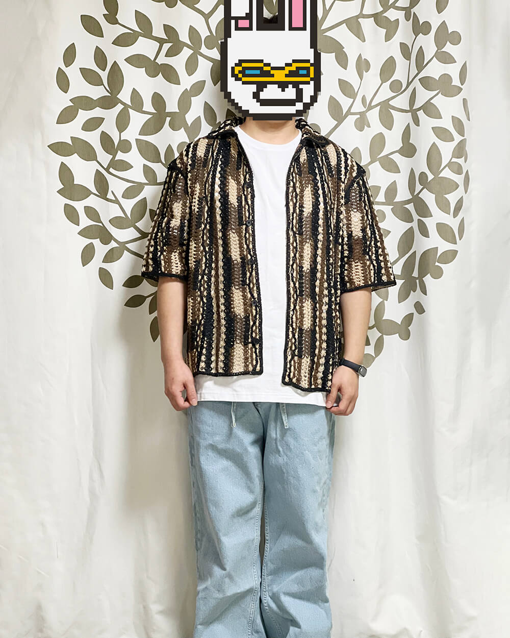 요즘 제가 빠져 있는 크로셰 셔츠입니다. 제품이 정핏으로 나온 듯한데 세미오버핏으로 입는 게 좋을 듯합니다. 늦봄이나 초가을에 입기 좋을 듯하고 약간 무게감은 있습니다.
